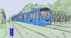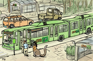 At left, electrically powered buses feed commuters to tram and train stops, while at right, trams/light rail service the suburbs, at times passing along a right-of-way through green belts. |